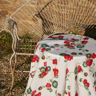 Introducing the Geranium design. A joyful ode to the high days of summer, bursting with vibrant pops of red and the lush green of garden leaves. Inspired by the classic geranium—sun-loving and full of cheerful colour. This print captures the carefree spirit of warm afternoons and windowsills in bloom. A striking way to bring summer’s energy to your table, indoors or out, all year round.