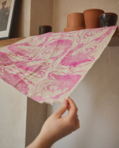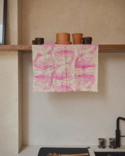 Pepe the prawn fabric. Two pinks with a little glitter prawn print. Hand printed and painted in London. Perfect for curtains and soft furnishing.