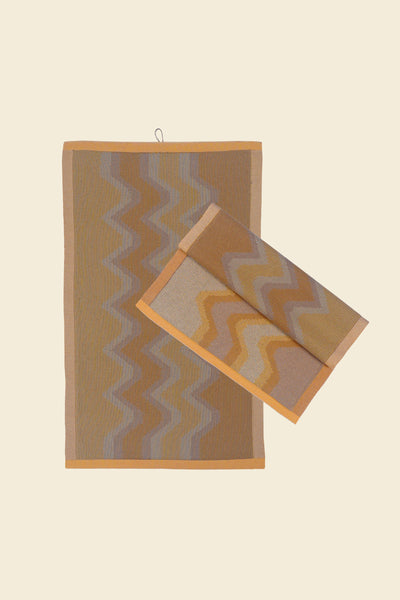 A sustainable knitted kitchen towel made from organic cotton. Inspired by woven ikat textiles, it embraces imprecise graphics for a unique, artistic look. The special weave-in technique adds stability to the towel, making It durable for countless uses in your kitchen.