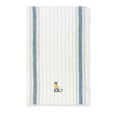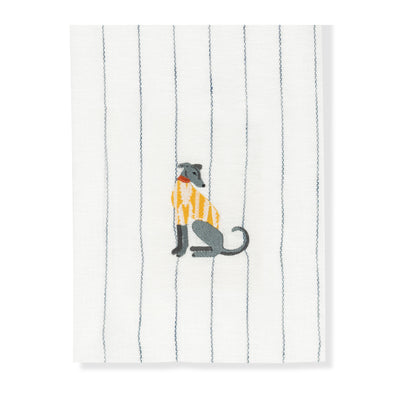 The Blue Stripe kitchen towel features a unique embroidery of a Lurcher in Ochre Shashka Printed Jumper. These washed linen towels are soft, fast-drying and durable.