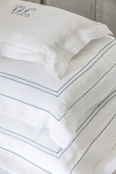 Boudoir pillow with a classic Oxford edge and embroidered by hand with frame of hemstitch drawn thread work.