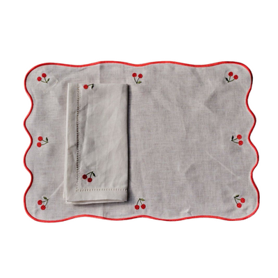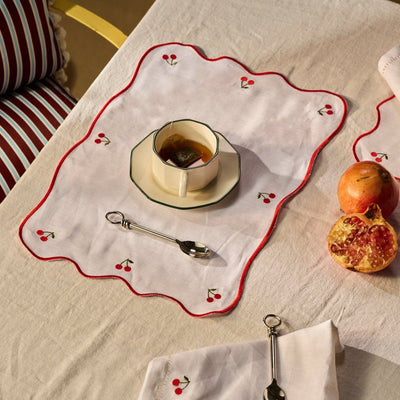 Placemat made of white linen with embroidered cherries and contrasting waving edge in red.