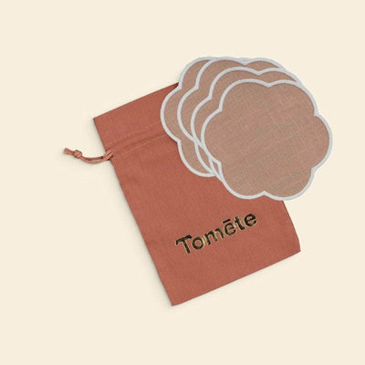 These four round scalloped coasters in 100% thick washed linen (205g/m²) are as useful as they are beautiful, to bring a touch of chic and originality to your aperitifs. The scalloped embroidery is meticulously crafted for impeccable results. They can be combined with our signature scalloped placemats and napkins. Delivered in a pretty cotton pouch.