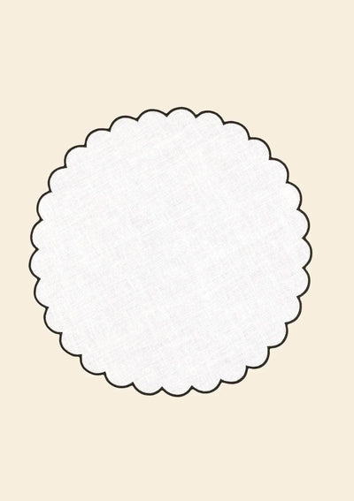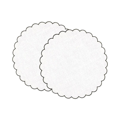 These two scalloped round placemats in 100% thick washed linen (205g/m²) bring a touch of chic and originality to your everyday or special occasion tables. The scalloped embroidery is meticulously crafted for impeccable results. They can be combined with our signature scalloped napkins and coasters.