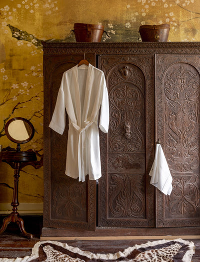 Volga’s Liège linen robes are soft to the touch and quick drying. They have a beautiful waffle texture and an Ivory White hemstitch detail along the placket and cuffs.