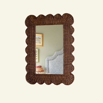 The Mimi Scalloped Mirror is available in two sizes and colors. The scallops are handwoven with sustainable rattan and cane.