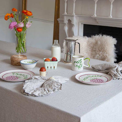 The warm, earthy tones of Brume echo the rustic charm of timeworn stone and mist-covered fields. Finished with a delicate ruffle, this napkin balances relaxed sophistication with natural beauty, perfect for creating an inviting, tactile tablescape.