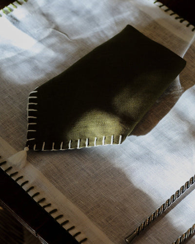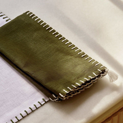 Pair of dark green linen napkins with contrasting stitching in pure white and small tassel on the edge.