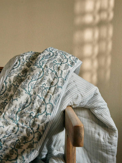 Reversible cotton quilt in light blue tones. On one side, enjoy the clean, modern look of bold stripes, perfect for a sleek and stylish touch. Flip it over, and you’ll be greeted by a charming floral print that brings warmth and a touch of nature indoors. Whether you’re in the mood for a contemporary vibe or a soft, blooming atmosphere, this quilt has got you covered.