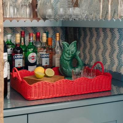 The Red Rattan Scalloped Tray is handwoven using rattan and cane. This scalloped wicker tray is available in 3 different colours; red, teak and natural. This large rectangular tray has two handles on either side which are useful when using it as a serving tray.