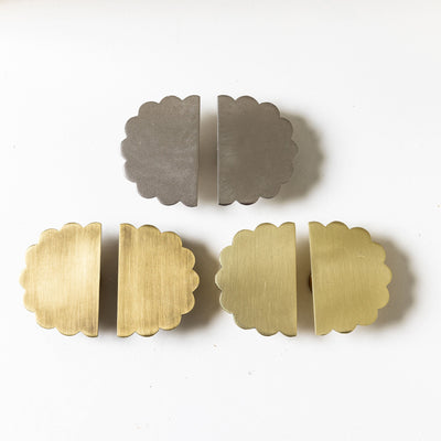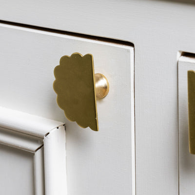 Add a refined, decorative flair to your furniture with these Scallop Brass Knobs. Handcrafted from solid brass and available in Lacquered Brass, Antique Brass, and Polished Chrome.