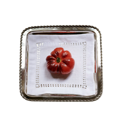 This square tray is crafted from high-quality stainless steel and features a beautifully twirl edge for a refined finish. It comes with a linen napkin with hemstitch, thoughtfully designed to fit the tray perfectly and add a touch of softness and charm.