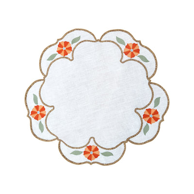These placemats stand out for their unique petal-shaped circular pattern, which brings a sculptural, organic silhouette to the table. The bold orange floral embroidery adds a lively pop of color. The raffia-effect trim around the edges echoes natural materials and adds a tactile, handcrafted finish.