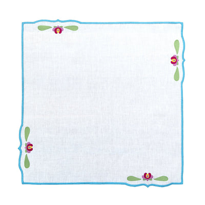 This vibrant napkin takes inspiration from the playful curves of the bulbous buttercup. Each piece is expertly hand-embroidered, showcasing delicate floral detailing. The standout feature is its unique, hand-cut edge.