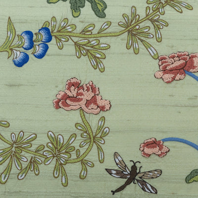 This unique cushion features a hand-embroidered floral design on rich green silk, inspired by the intricate beauty of traditional Chinese silk embroideries. The central green panel is bordered by black silk, delicately embroidered in a pale pink Chinese-inspired pattern, adding contrast and refinement. Set against a soft cream 100% linen background, the composition evokes a timeless, vintage feel.