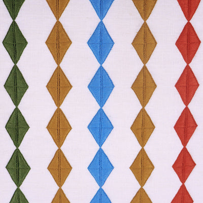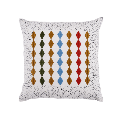 This artisan-made linen cushion cover features raised hand embroidery, creating a stunning 3D effect with a string of diamond motifs. The intricate design adds depth and texture, transforming a classic pattern into a modern, eye-catching piece.