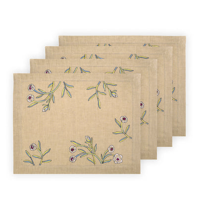 Elevate your dining experience with these exquisite 100% linen placemats, featuring delicate hand embroidery in soothing shades of blue and yellow. Set against a crisp white background, the embroidery mimics a painterly effect-soft, flowing strokes that evoke the gentle blending of watercolor on fabric. This subtle artistry brings a serene, nature-inspired palette to your table.