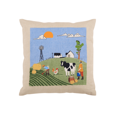 This linen cushion cover features a hand-embroidered depiction of typical Scandinavian village life, capturing its charm and simplicity. Crafted by skilled artisans, the detailed embroidery on top of a screen-printed background brings this serene, picturesque scene to life.