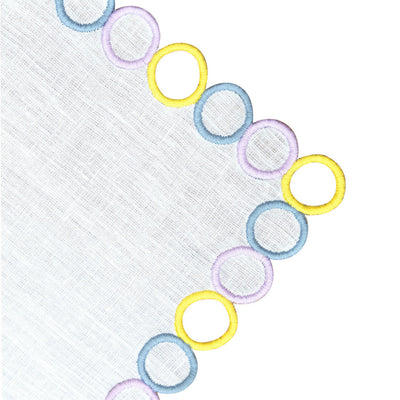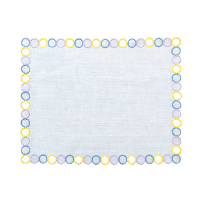 This design showcases embroidered circles around the perimeter, with select circles carefully cut out by hand to add depth and creates a playful optical illusion that is both fun and visually intriguing. This technique produces a subtle movement effect, making the placemat appear lively and contemporary.