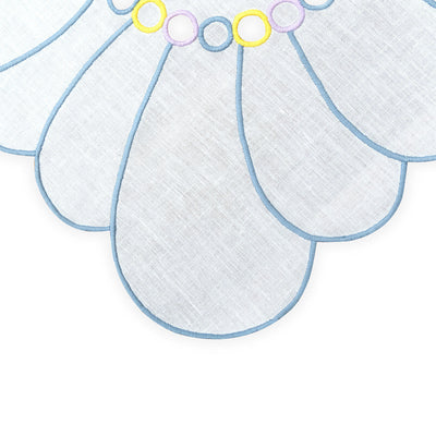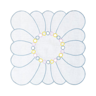 This design showcases embroidered circles around the center, with select circles carefully cut out by hand to add depth and creates a playful optical illusion that is both fun and visually intriguing. The napkins are finished with a  scalloped edge.