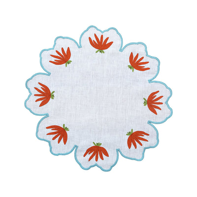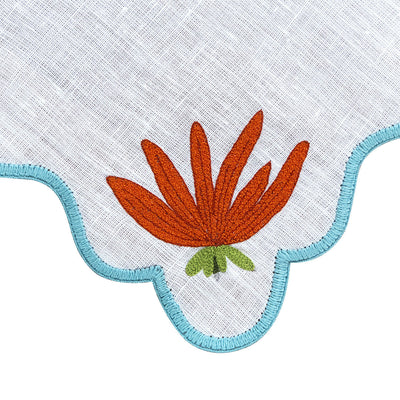 Brighten your table with this stunning hand-embroidered placemat, crafted from 100% premium linen in a vibrant orange hue. Inspired by the bold shapes of contemporary floral design, it features intricate hand embroidery that brings the modar flower motif to life.