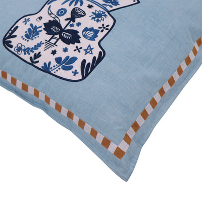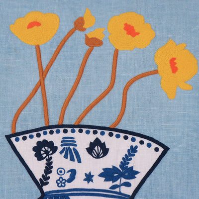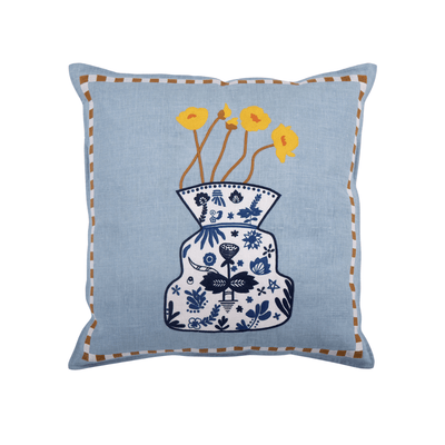 Inspired by still life paintings, this linen cushion cover features a stunning hand-embroidered vase design, drawing inspiration from classic Chinese porcelain in vibrant blues. Crafted with intricate detail on top of a screen-printed background by skilled artisans, the design brings a timeless elegance and artistic flair to your home decor.