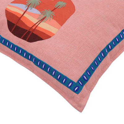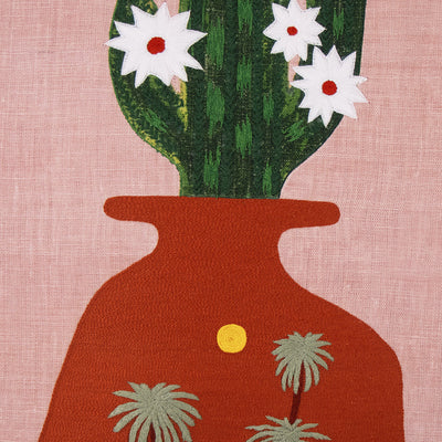 This linen cushion cover, inspired by still life paintings, showcases a hand-embroidered desert landscape beautifully depicted on a vase. The intricate embroidery on top of a screen-printed background captures the vast, serene beauty of desert scenery, bringing a unique and artistic touch to your home decor.