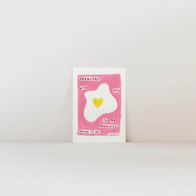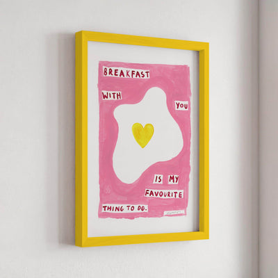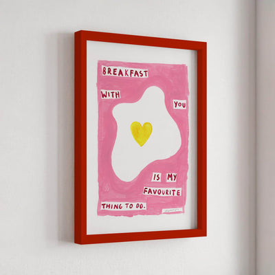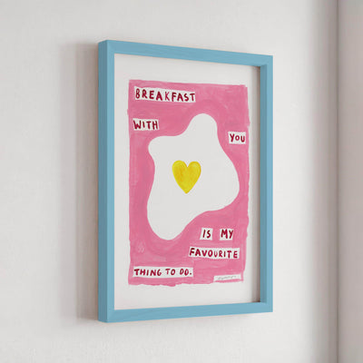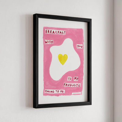 "Breakfast with You is My Favorite Thing to Do," features a hand-painted egg with a heart in the middle against a soft pink backdrop. This charming piece brings a sweet touch to any space, celebrating the joy of shared mornings over breakfast. Ideal for your kitchen or as a thoughtful gift, enjoy life's little joys of beginning your day together.