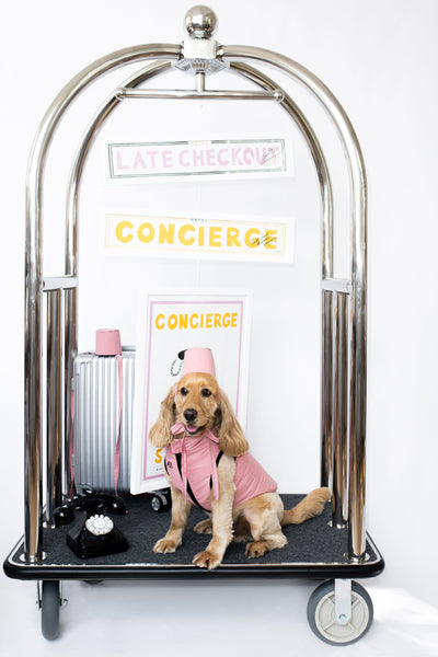 The Paw Seasons Collection features playful illustrations of dachshunds, Dalmatians, and cocker spaniels enjoying luxury hotel experiences. Inspired by our four-legged friends, these joyful art prints showcase canine companions enjoying "Concierge Service", "Late Checkout", "Room Service", and "Aperitif Service". Created for every room in the house.