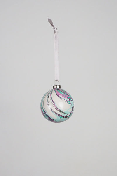 These delightful baubles are hand marbled in Lincolnshire making each one completely unique. This delightfully vibrant Christmas bauble will add colour to any tree. And in shades synonymous with the poisonous arsenic wallpapers of the 19th century, this palette embodies the decadent Christmas décor of the Victorian era. Also a sparkly snow white pigment softens the turquoise and royal purple. These colours will fit effortlessly among your prized decorations and add a subtle swirl of pattern.