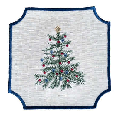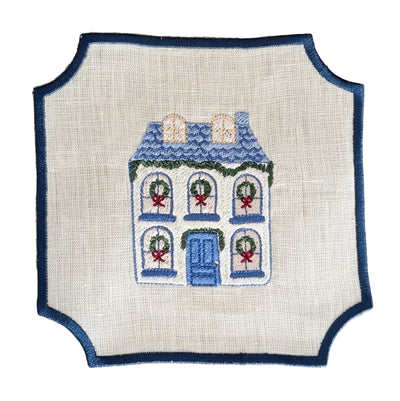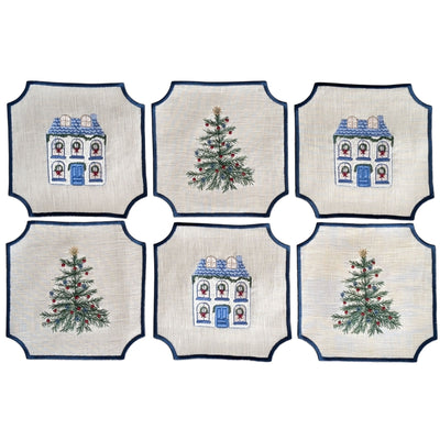 Set of 6 off white cocktail napkins with Christmas motifs embroidered (3 christmas houses and 3 trees) and a blue piping.
