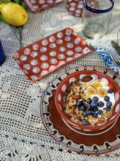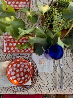 With designs commissioned by Anthologist's founder, Anthologist’s ceramics represent a return to authenticity. Each piece is hand-painted in an Athens workshop, a place we share with an artisan from a long line of ceramicists on the island of Crete. The modern and simplistic dot design reflects Anthologist’s cherished merging of two worlds and eras, symbolizing order and harmony and echoing the Hellenic fascination with geometry and symmetry. The orderly dotted pattern is believed to ward off evil spirits and bring good fortune. A stunning addition to any table, the pieces look as chic in a contemporary setting as they do at Andria’s beloved Panito Cottage in Paros.