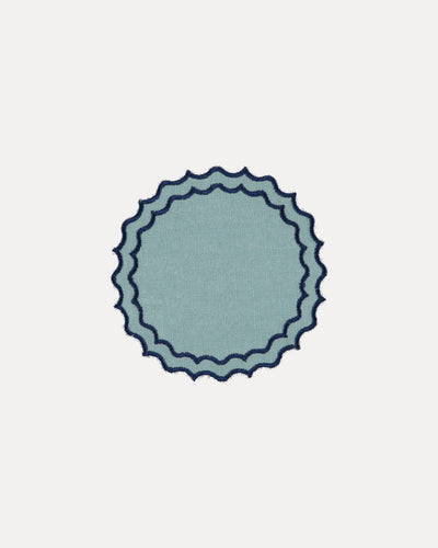 Coaster made of a linen and cotton blend, with a circular cut and double scalloped edge. A functional and elegant detail to protect surfaces while adding a touch of color and texture to the table.