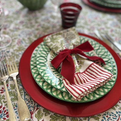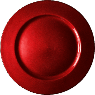 A fun electric red melamine charger plate.  This lifts any table and provides a bright pop of colour; it works especially well when placed under your dinner plate.