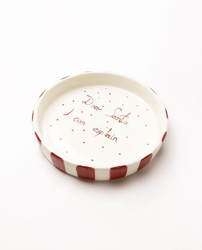Bring humor and festive charm to your holiday table with our handcrafted ceramic “Dear Santa, I Can Explain” plate. Featuring bold red stripes and a playful handwritten message inside, it is perfect for serving cookies, treats, and Santa’s midnight snacks. Made from high-quality clay and finished with a food-safe glaze.