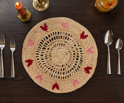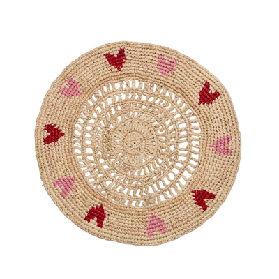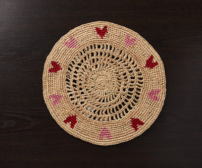 Handwoven Heart Raffia Placemat – Artisan Table Décor with Red & Pink Hearts