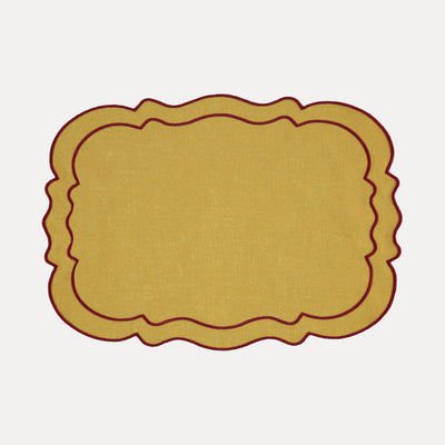 The Clou placemat combines a romantic design with rounded edges, offering charm and elegance to your table. Now available in a mustard shade with Christmas Bordeaux (burgundy), perfect for the festive season. Details: