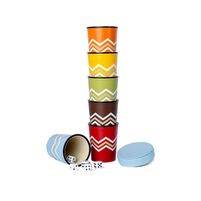 This luxury & colourful version of the classic Perudo game will make a stylish addition to any games evening and the perfect gift for a game lover. Each of the 6 dice cups are bound in colourful leather with our signature zigzag print. Each game comes in a gift box.
