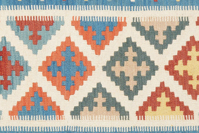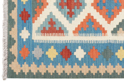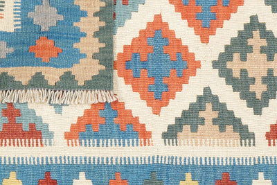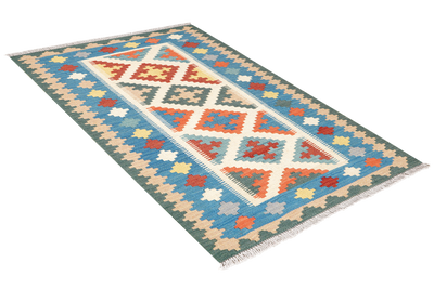 Length (in cm): 138 Width (in cm): 84 Color: Beige Square Meters (sqm): 1.16 Border: Blue Pile Height (in mm): approx. 5 Type: Kelim Size Code: 80x120 Weight (in kg): approx. 1.74