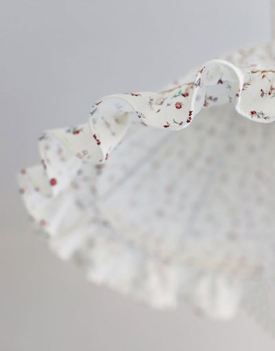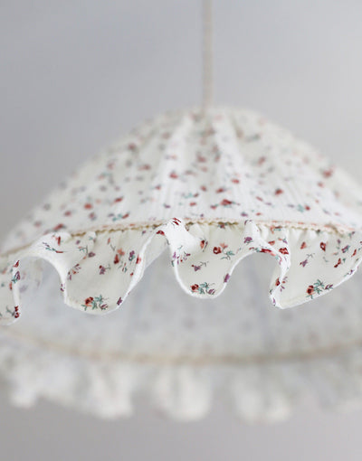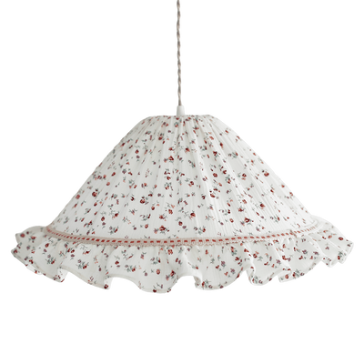 This delicate pendant light features a conical lampshade in double cotton gauze printed with tiny flowers on an off-white background, finished with a charming ruffle. Its material diffuses a soft, enveloping light that blends timeless charm with modern appeal. Perfect in a dining room, bedroom, or reading nook, it creates a refined and original atmosphere.