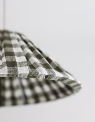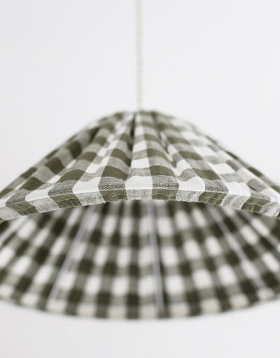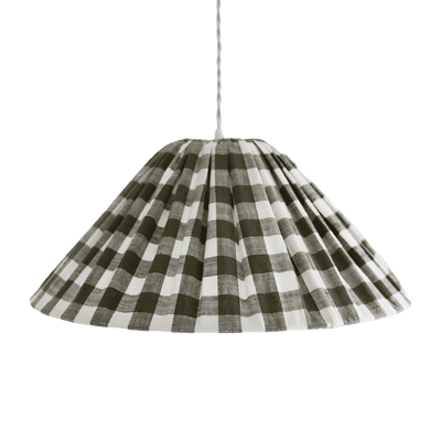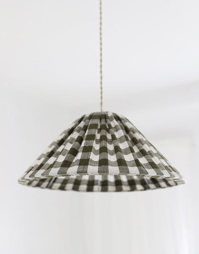 This unique pendant light features a conical lampshade covered in flame cotton canvas with large white and khaki green checks.