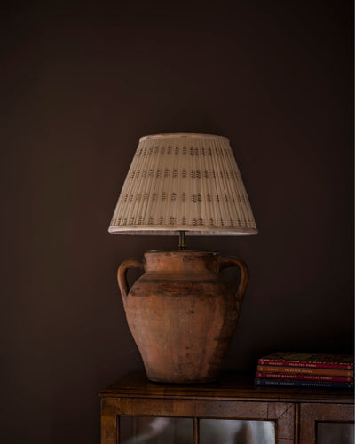 A patterned lampshade defined by its delicate soft brown cross-stitch embroidery. Against a backdrop of our creamy lightweight cotton, the pairing is demure and gentle for bedside lamps or sitting room wall lights alike.