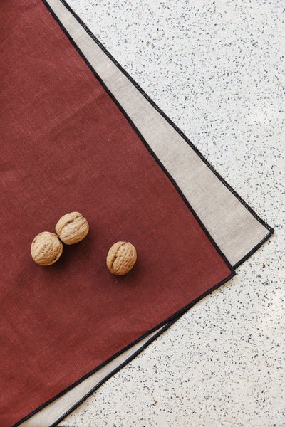 The PILE OU FACE napkins are made of a delicate linen and are finished with a satin stitch all around the edge. They are double-sided, with a colour on each side.