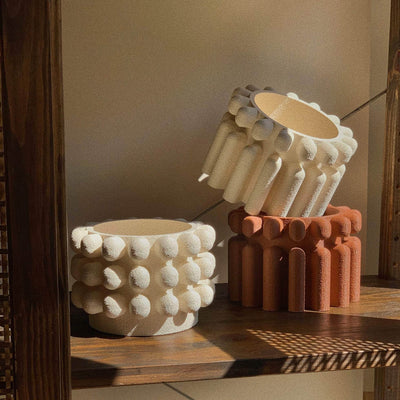 This textured planter is 3D printed using recycled PLA - a biodegradable and eco-friendly material derived from renewable resources like cornstarch or sugarcane.
