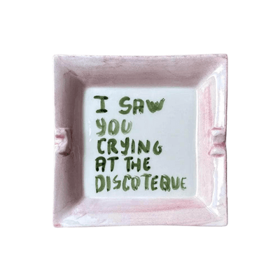 Introducing the "I Saw You Crying at the Discoteque" Ashtray: a nostalgic and humorous piece that captures an unforgettable moment of disco party discomfort. Measuring 17 cm x 17 cm, this versatile accessory serves as both an ashtray and a catchall.