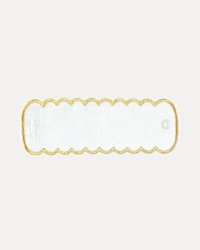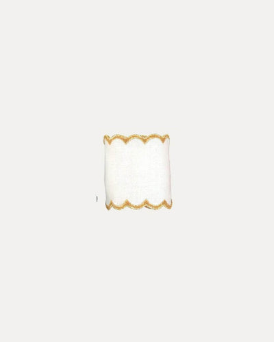 Add a special touch to your table with our personalized red linen napkin ring. Featuring scalloped edges and an elegant white trim, this ring is the perfect addition to any table setting.