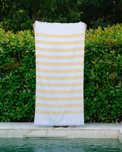 Cotton beach towel with a striped design and frayed edge detailing along the width.