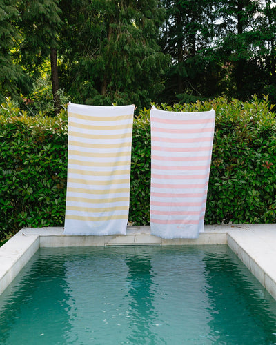 Cotton Beach Towel with a striped design and frayed edge detailing along the width.
