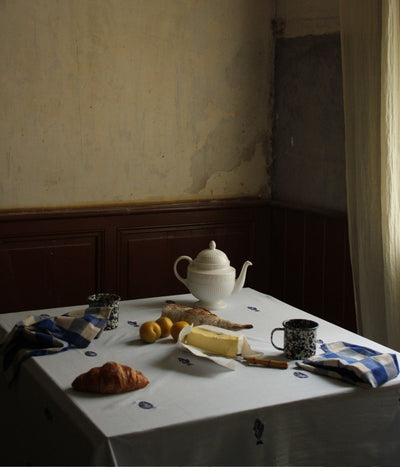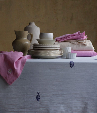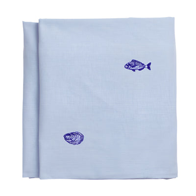 Josefin La mer tablecloth from Swedish Brand Midnatt has a light blue base with cobalt blue embroideries of oysters and sea breams. The Josefin La mer tablecloth comes in four sizes. It is GOTS-certified and made of 100% organic cotton.