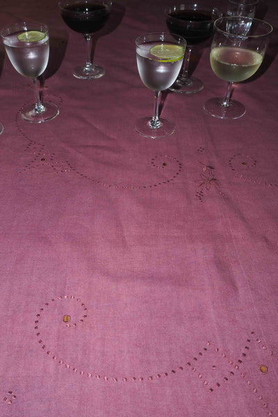 An antique tablecloth hand dyed in Burgundy. Perfect for you unique dinner party tablescape. This wonderful antique tablecloth is decorated with scrolling broderie anglaise, embroidery detail and a scalloped edge. We have hand dyed this piece in the Wildmore Studio to give it a new lease of life. The vintage linen fabric has picked up the dye in a beautiful flecked fashion. Each of our hand dyed vintage and antique linens is completely unique, perfect for hosting a memorable diner party.